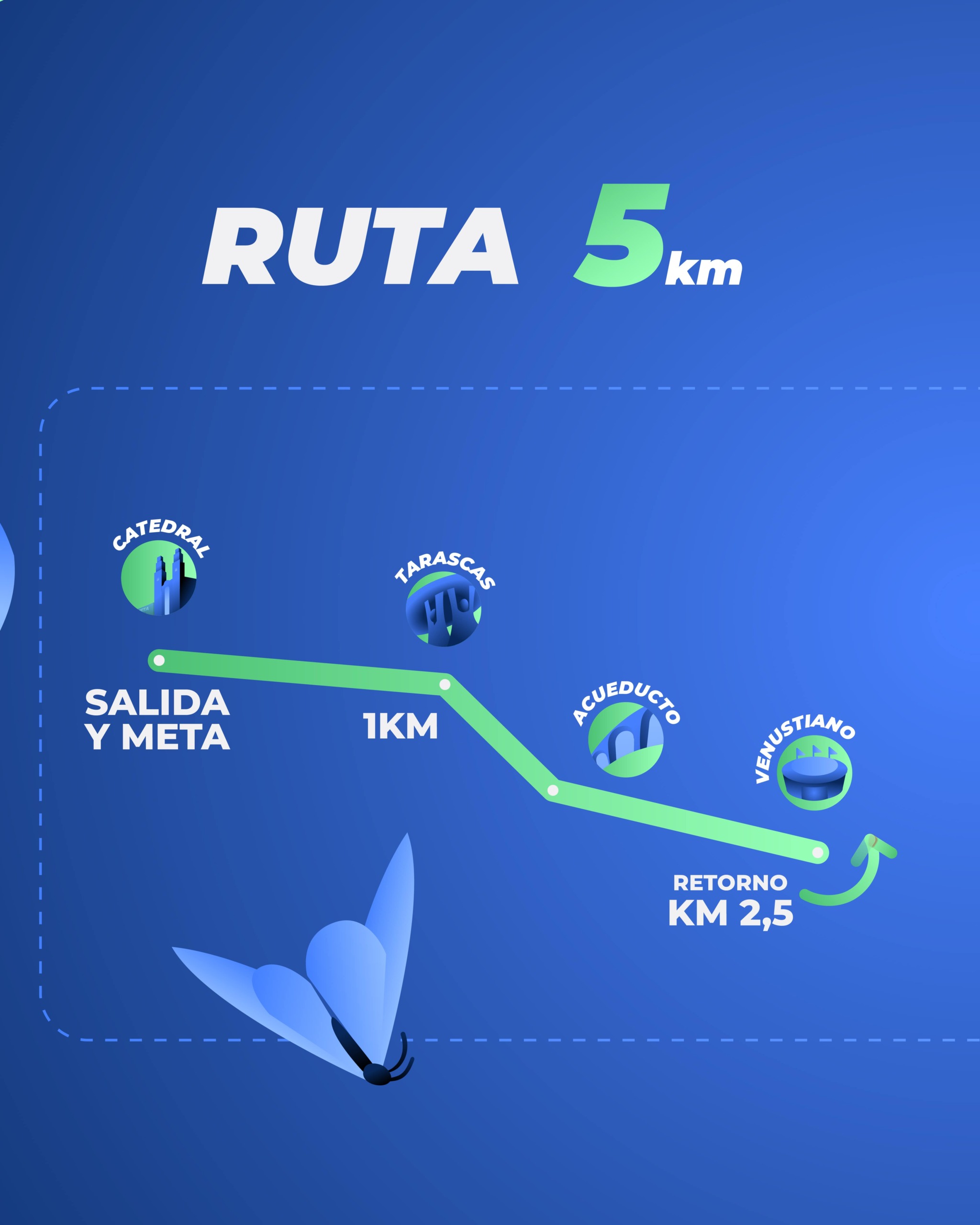 La salida y meta de la carrera se encontrarán frente a los portales en la Catedral de Morelia, se correrá sobre Av. Francisco I. Madero para tomar a mano derecha sobre Acueducto, terminando el acueducto daremos vuelta en “u” para regresar sobre la misma avenida hasta llegar a la Catedral. Hacemos de tu conocimiento que buscando que la ruta fuera lo más cómoda posible para los corredores, ésta será de 5,600 metros.