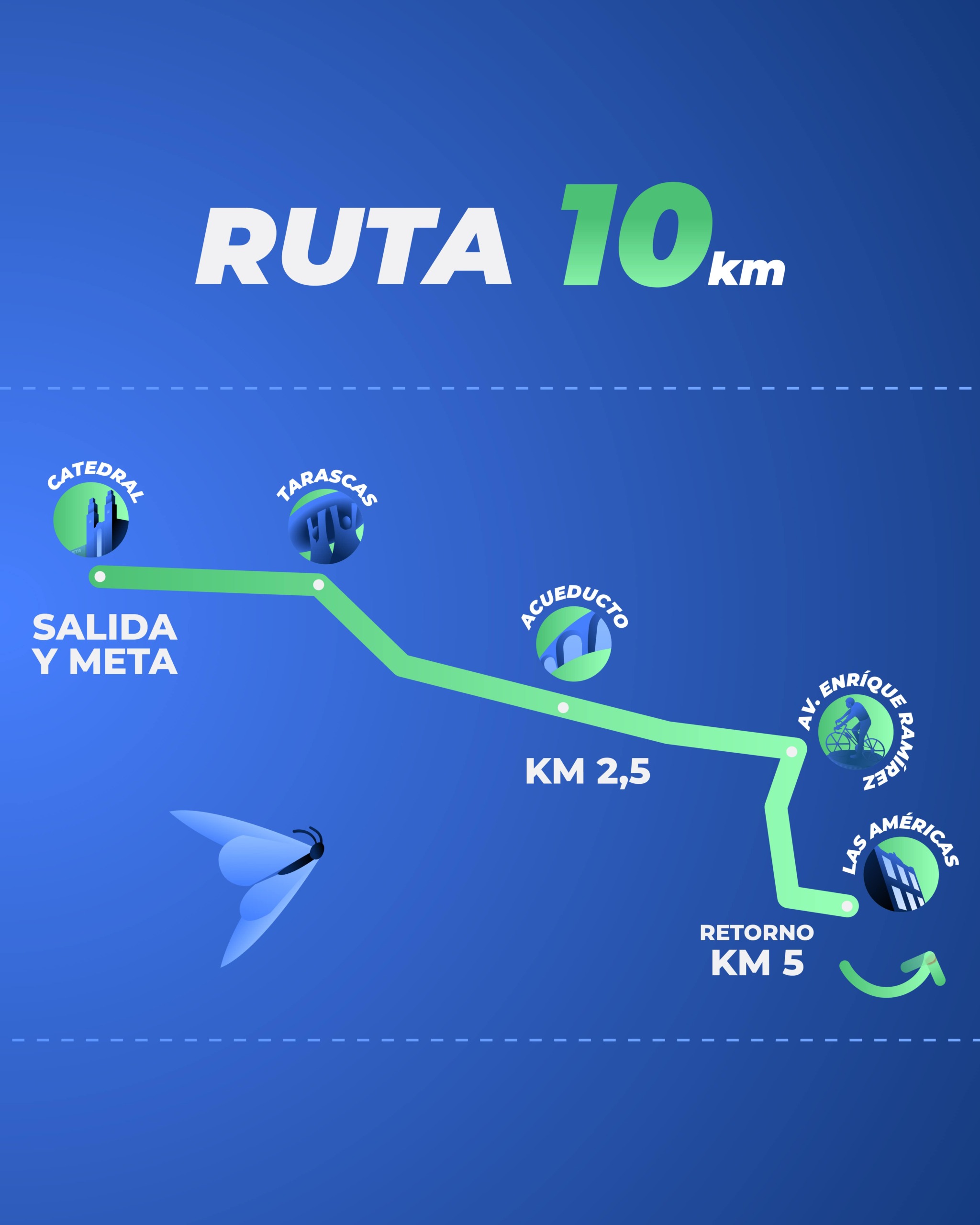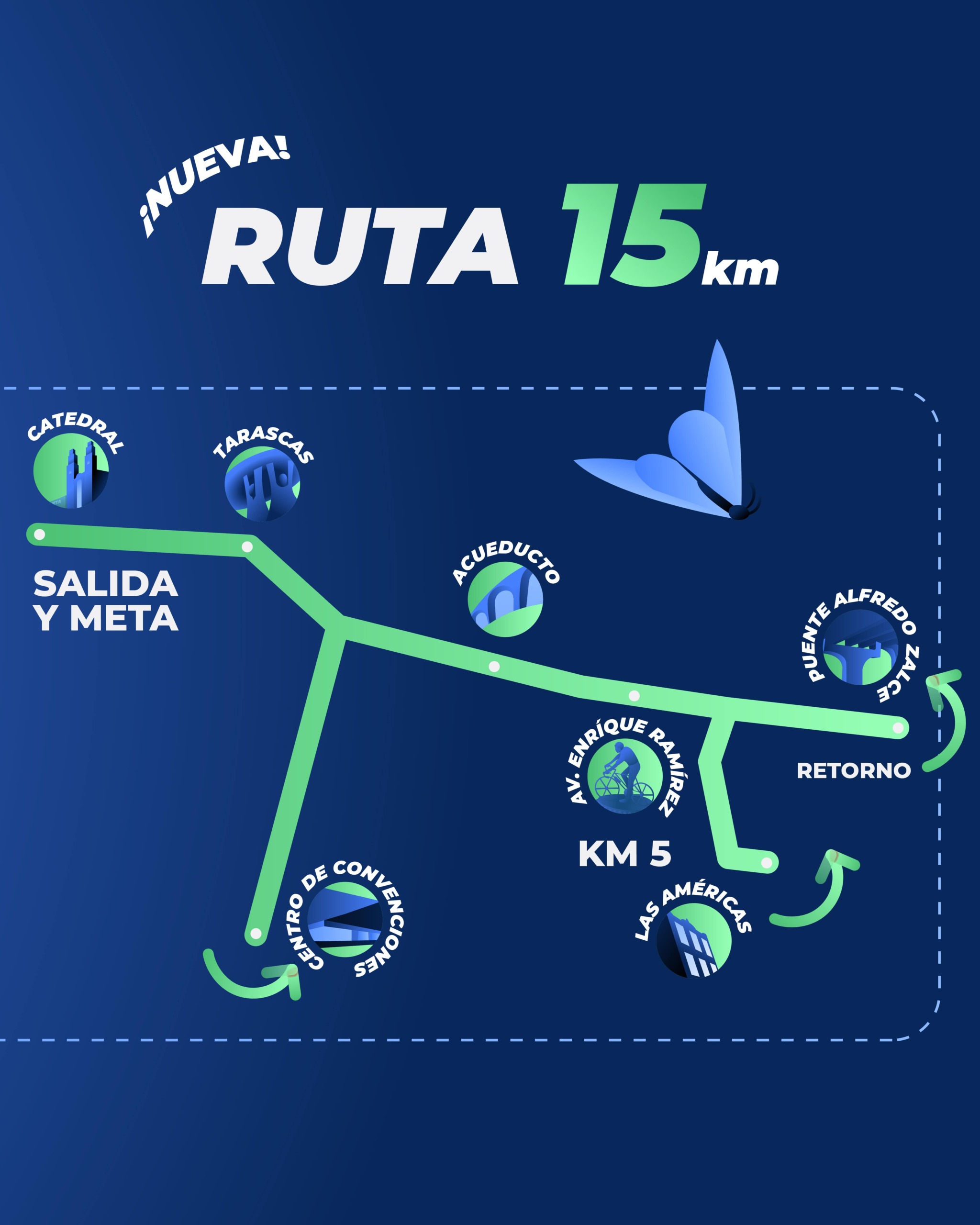 La salida y meta de la Carrera Fundación Cinépolis® se encontrarán frente a los portales en la Catedral de Morelia, se correrá sobre Av. Francisco I. Madero para tomar a mano derecha sobre Acueducto. En la Av. Ventura Puente daremos vuelta a mano derecha hasta llegar frente al Centro de Convenciones, dando vuelta en “u” para retornar por la misma Av. Ventura Puente hasta llegar nuevamente a la Av. Acueducto hasta la Av. Enrique Ramírez Miguel donde daremos vuelta a mano derecha hasta llegar a Plaza Espacio Las Américas, dando vuelta en “u” frente a la misma para regresar por la misma Av. Enrique Ramírez Miguel, llegando de nueva cuenta a Av. Acueducto en donde el trayecto continuaría hasta unos metros antes del crucero de la salida de Mil Cumbres en donde se retornaría por todo Av. Acueducto hasta Av. Madero y llegar finalmente a la meta frente a la Catedral.